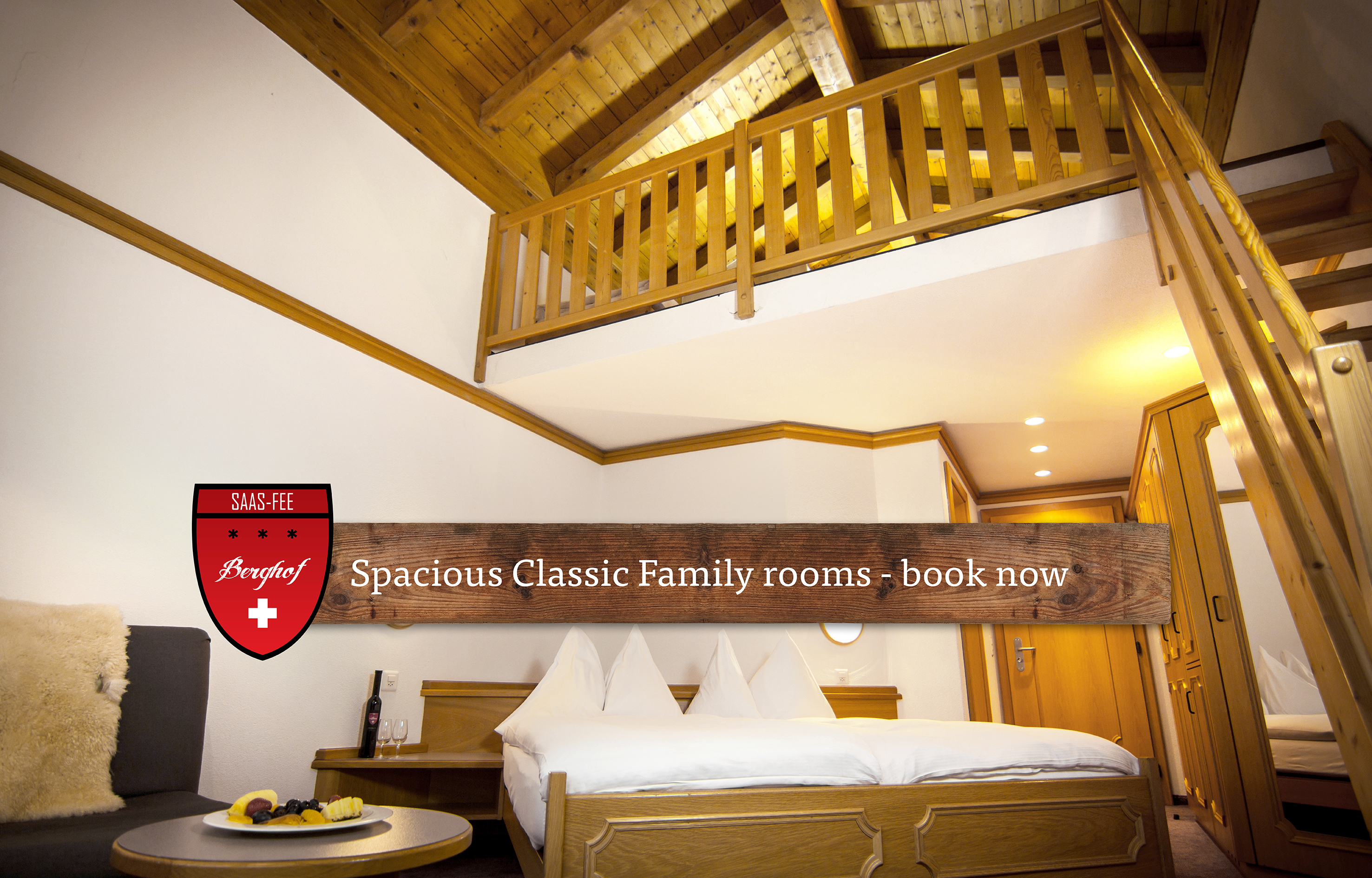 Diese Kategorie besticht mit einzigartigem Zimmerschnitt. Ihre Kinder werden von den Betten unter dem Dach begeistert sein. Eine Treppe führt zu ihrem eigenen Reich während die Eltern unten im bequemen Doppelbett schlafen. Die Zimmer verfügen über Bad mit WC und Badewanne/Dusche sowie einen Flachbildfernseher und kostenfreies Wi-Fi.